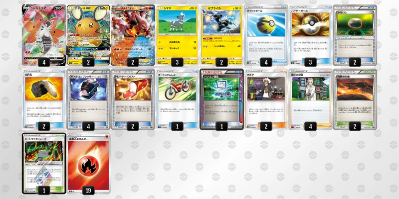 1ターンに出したい最大打点はVMAXの330HPまで見られていればまあまあ十分かなと思ってます。素で16枚、ボルケニオン込みなら14枚のラインを求めると、サイド落ちも含めたらエネルギーは19枚が最低ラインかなと思いました。
