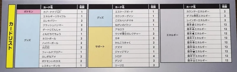 他にも、グズマ・ジャッジマン・シロナ・リーリエ・ハイパーボールのような、こういうときにいつも入っているカードも入っています。シロナだけ4枚入ってます。