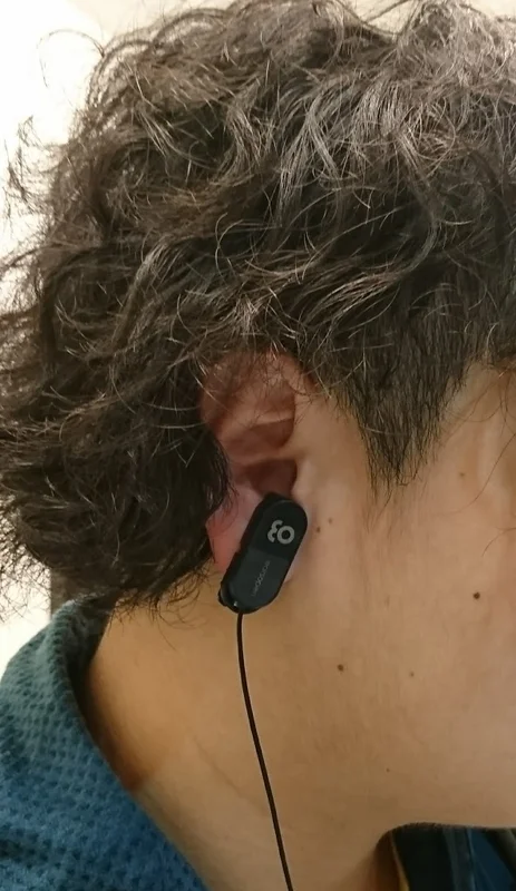 耳につけて聴くときがこんな感じです。耳の下の溝に引っ掛けて、耳たぶを挟み込むような形ですね。