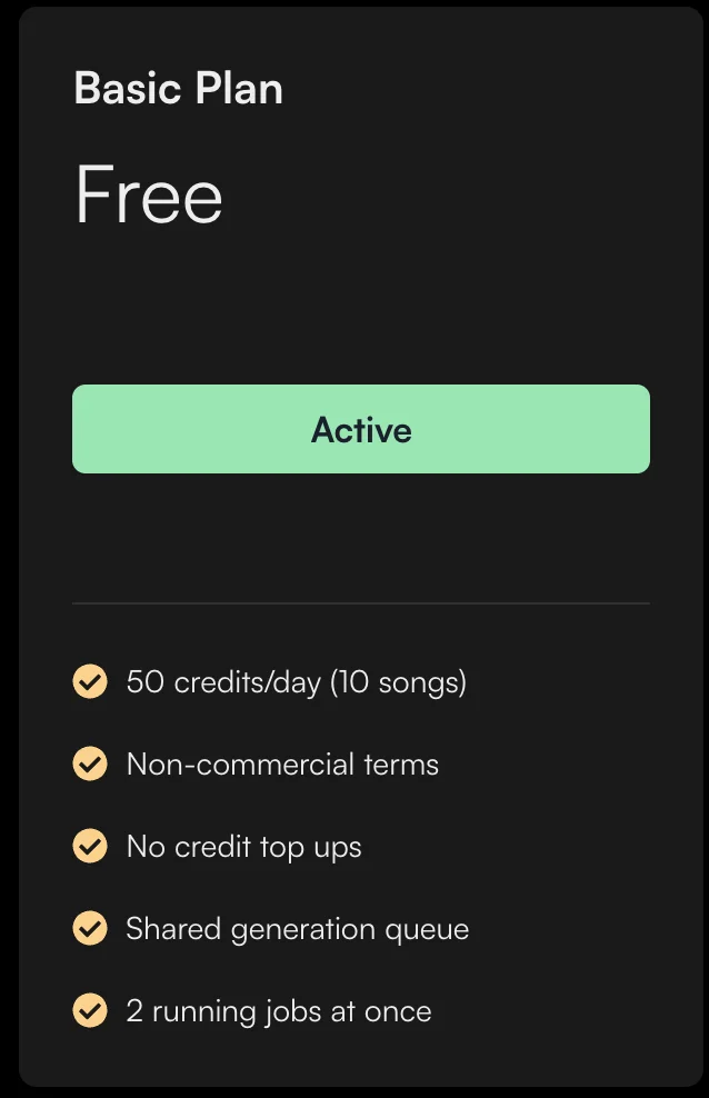 一回に2ジョブ、1ジョブで5credits使われるので、無料版では1日5回実行できて10曲作れる。という形式になります。